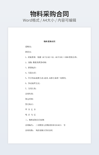 本作品内容为采购合同下载,大小为22.83KB,作品为高清大图模板,格式为docx, 属于采购合同模板,作品模板源文件下载后可用编辑替换,模板中如有人物画像仅供参考禁止商用。小Q办公网-提供简历,PPT,Word,Excel优质模板素材下载模版平台,拥有海量的工作总结、竞聘求职、年终颁奖、计划书等。 通过小Q办公网下载采购合同模板源文件编辑修改源文件文字和图片即可使用。
