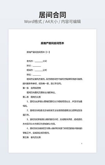 本作品内容为房地产项目居间合同下载,大小为18.88KB,作品为高清大图模板,格式为docx, 属于居间合同模板,作品模板源文件下载后可用编辑替换,模板中如有人物画像仅供参考禁止商用。小Q办公网-提供简历,PPT,Word,Excel优质模板素材下载模版平台,拥有海量的工作总结、竞聘求职、年终颁奖、计划书等。 通过小Q办公网下载居间合同模板源文件编辑修改源文件文字和图片即可使用。