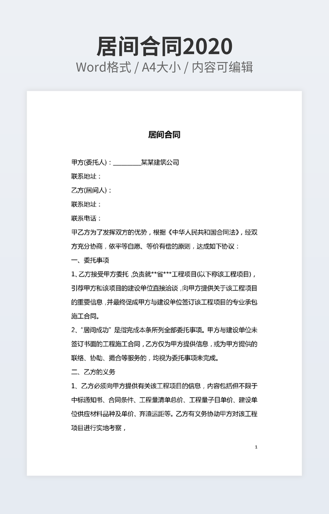 本作品内容为武汉市存量房居间(买卖)合同下载,大小为20.3KB,作品为高清大图模板,格式为docx, 属于居间合同模板,作品模板源文件下载后可用编辑替换,模板中如有人物画像仅供参考禁止商用。小Q办公网-提供简历,PPT,Word,Excel优质模板素材下载模版平台,拥有海量的工作总结、竞聘求职、年终颁奖、计划书等。 通过小Q办公网下载居间合同模板源文件编辑修改源文件文字和图片即可使用。