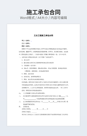 本作品内容为中外合资经营企业合同(工程承包、咨询)下载,大小为44.5KB,作品为高清大图模板,格式为doc, 属于承包合同模板,作品模板源文件下载后可用编辑替换,模板中如有人物画像仅供参考禁止商用。小Q办公网-提供简历,PPT,Word,Excel优质模板素材下载模版平台,拥有海量的工作总结、竞聘求职、年终颁奖、计划书等。 通过小Q办公网下载承包合同模板源文件编辑修改源文件文字和图片即可使用。