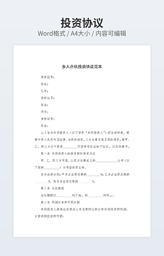 【特殊限制】设计师仅对作品中独创性部分享有著作权,对作品中含有的国旗、国徽等政治图案不享有权利,仅作为作品整体效果的示例展示,禁止商用。 相关关键词: 个人 投资 入股 协议书