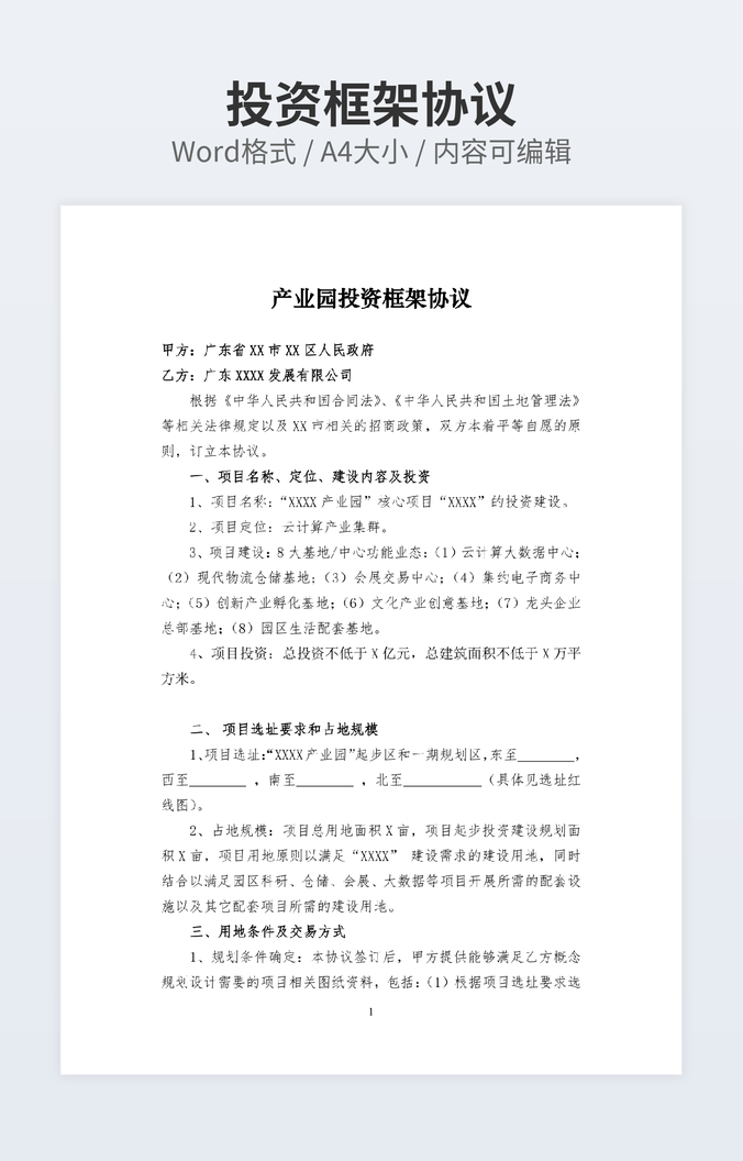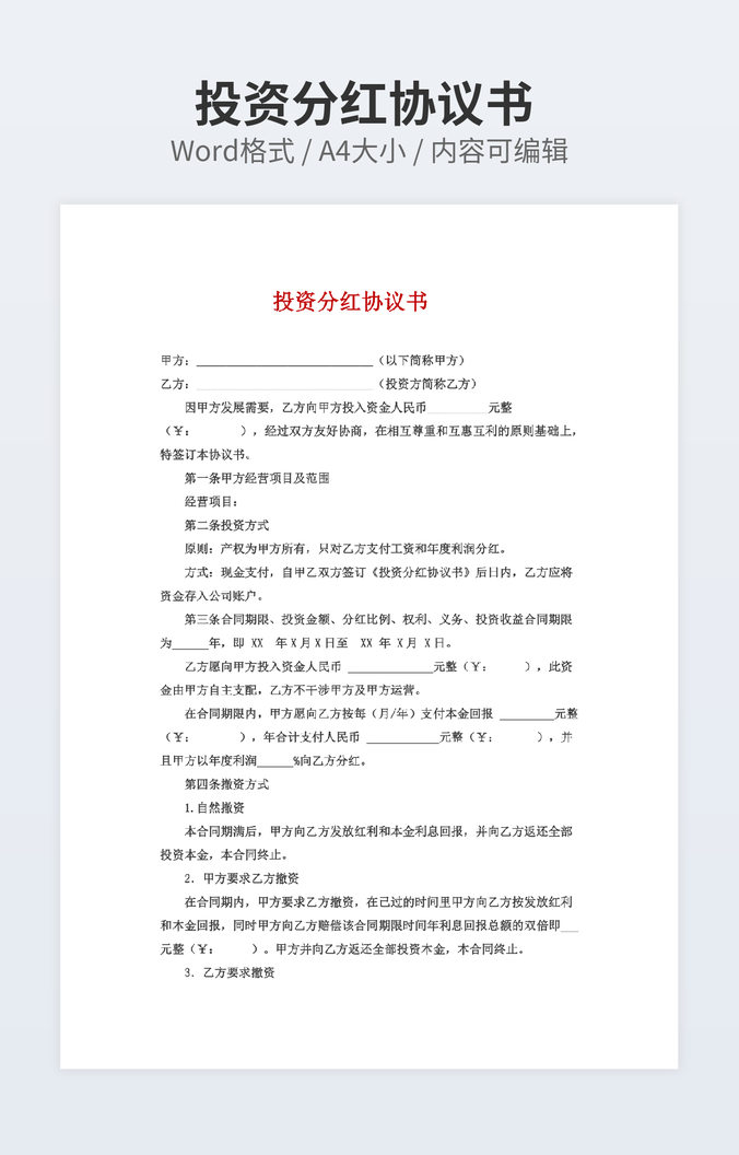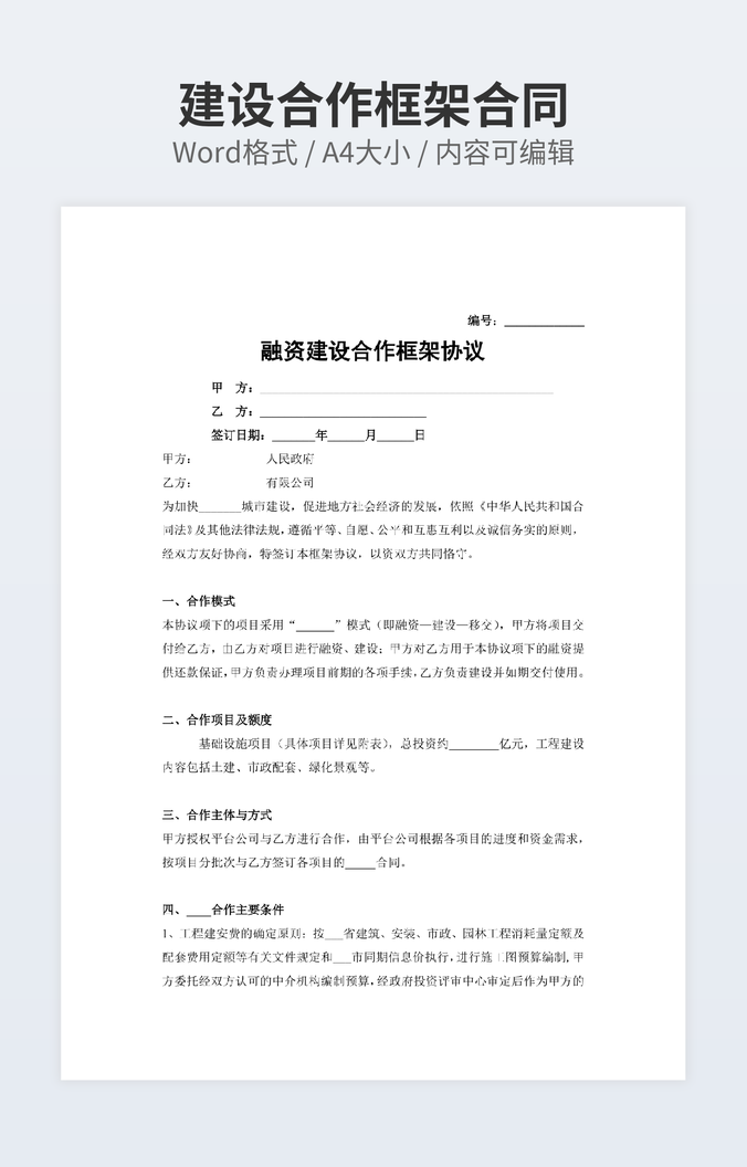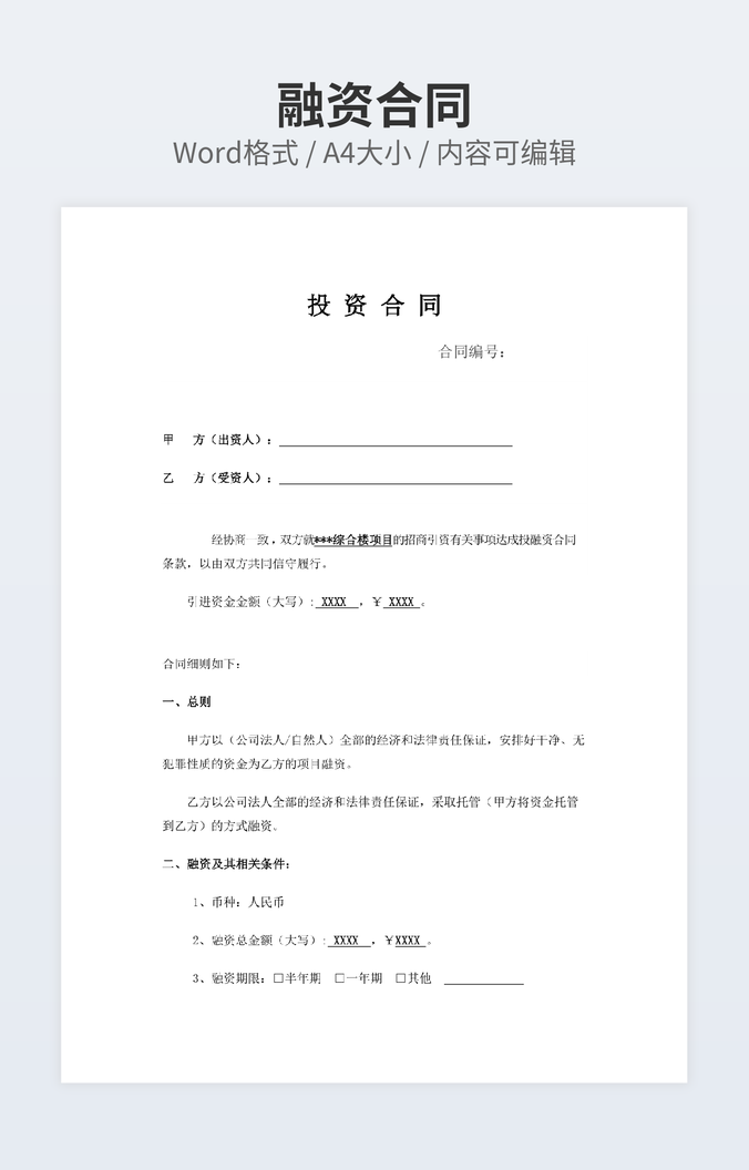 【特殊限制】设计师仅对作品中独创性部分享有著作权,对作品中含有的国旗、国徽等政治图案不享有权利,仅作为作品整体效果的示例展示,禁止商用。 相关关键词: 投资合作 合同 4篇