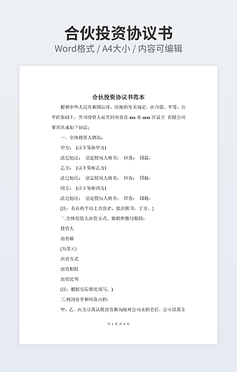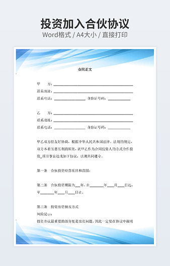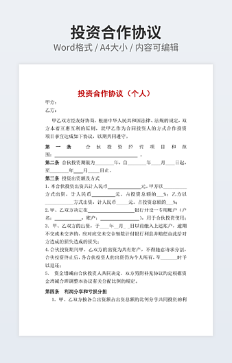 本作品内容为金融类投资合同2下载,大小为26.94KB,作品为高清大图模板,格式为docx, 属于投资协议模板,作品模板源文件下载后可用编辑替换,模板中如有人物画像仅供参考禁止商用。小Q办公网-提供简历,PPT,Word,Excel优质模板素材下载模版平台,拥有海量的工作总结、竞聘求职、年终颁奖、计划书等。 通过小Q办公网下载投资协议模板源文件编辑修改源文件文字和图片即可使用。