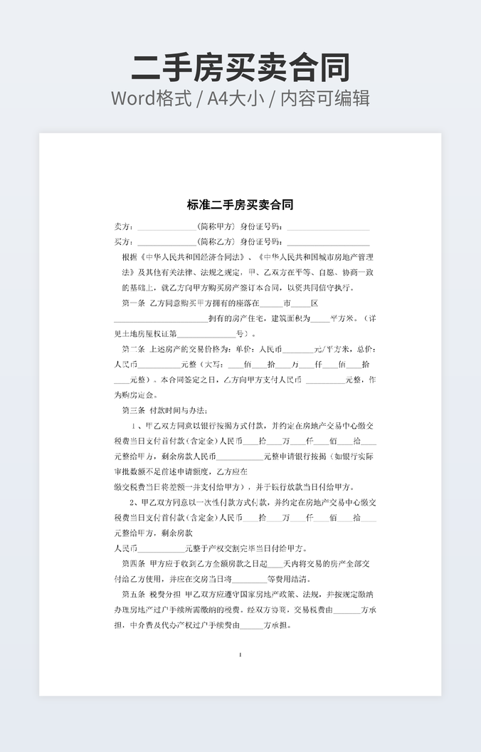 本作品内容为二手房屋买卖合同下载,大小为20.52KB,作品为高清大图模板,格式为docx, 属于房屋买卖模板,作品模板源文件下载后可用编辑替换,模板中如有人物画像仅供参考禁止商用。小Q办公网-提供简历,PPT,Word,Excel优质模板素材下载模版平台,拥有海量的工作总结、竞聘求职、年终颁奖、计划书等。 通过小Q办公网下载房屋买卖模板源文件编辑修改源文件文字和图片即可使用。