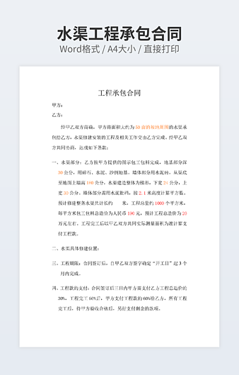 本作品内容为水电安装工程承包合同下载,大小为22.59KB,作品为高清大图模板,格式为docx, 属于承包合同模板,作品模板源文件下载后可用编辑替换,模板中如有人物画像仅供参考禁止商用。小Q办公网-提供简历,PPT,Word,Excel优质模板素材下载模版平台,拥有海量的工作总结、竞聘求职、年终颁奖、计划书等。 通过小Q办公网下载承包合同模板源文件编辑修改源文件文字和图片即可使用。