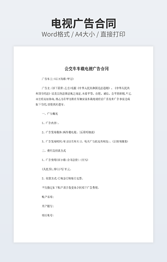 本作品内容为影视广告合同范文下载,大小为25KB,作品为高清大图模板,格式为doc, 属于广告合同模板,作品模板源文件下载后可用编辑替换,模板中如有人物画像仅供参考禁止商用。小Q办公网-提供简历,PPT,Word,Excel优质模板素材下载模版平台,拥有海量的工作总结、竞聘求职、年终颁奖、计划书等。 通过小Q办公网下载广告合同模板源文件编辑修改源文件文字和图片即可使用。