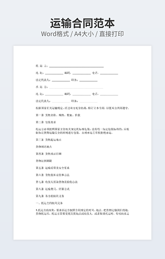 本作品内容为道路旅游运输合同格式下载,大小为18.78KB,作品为高清大图模板,格式为doc, 属于运输合同模板,作品模板源文件下载后可用编辑替换,模板中如有人物画像仅供参考禁止商用。小Q办公网-提供简历,PPT,Word,Excel优质模板素材下载模版平台,拥有海量的工作总结、竞聘求职、年终颁奖、计划书等。 通过小Q办公网下载运输合同模板源文件编辑修改源文件文字和图片即可使用。