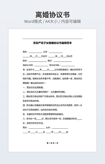 【特殊限制】设计师仅对作品中独创性部分享有著作权,对作品中含有的国旗、国徽等政治图案不享有权利,仅作为作品整体效果的示例展示,禁止商用。 相关关键词: 无子 子女 财产 离婚 离婚协议 协议书 模板
