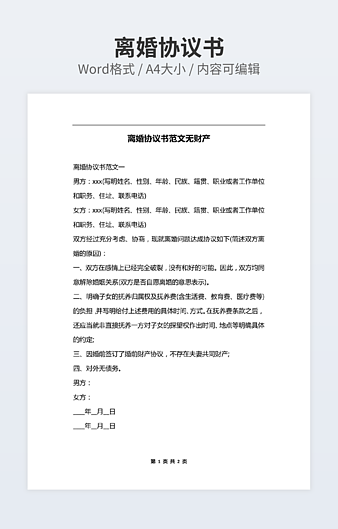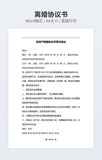 本作品内容为离婚协议书范X无财产下载,大小为20.37KB,作品为高清大图模板,格式为docx, 属于无财产离婚协议模板,作品模板源文件下载后可用编辑替换,模板中如有人物画像仅供参考禁止商用。小Q办公网-提供简历,PPT,Word,Excel优质模板素材下载模版平台,拥有海量的工作总结、竞聘求职、年终颁奖、计划书等。 通过小Q办公网下载无财产离婚协议模板源文件编辑修改源文件文字和图片即可使用。