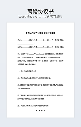 【特殊限制】设计师仅对作品中独创性部分享有著作权,对作品中含有的国旗、国徽等政治图案不享有权利,仅作为作品整体效果的示例展示,禁止商用。 相关关键词: 离婚 离婚协议 协议书 财产