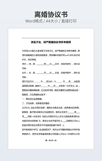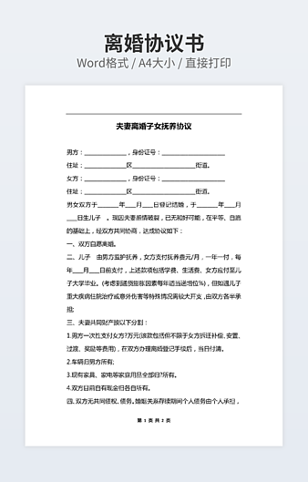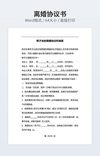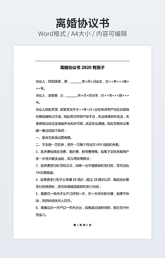 【特殊限制】设计师仅对作品中独创性部分享有著作权,对作品中含有的国旗、国徽等政治图案不享有权利,仅作为作品整体效果的示例展示,禁止商用。 相关关键词: 小孩 离婚 离婚协议 协议书 格式