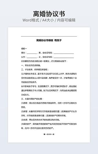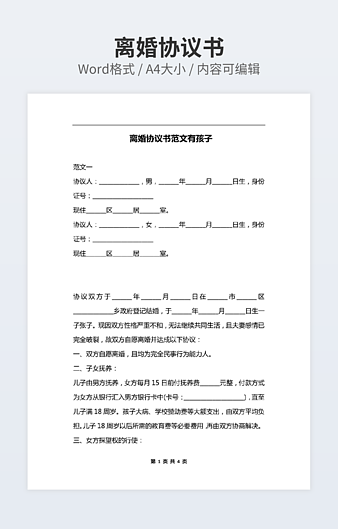 本作品内容为有小孩的离婚协议书格式下载,大小为20.68KB,作品为高清大图模板,格式为docx, 属于有子女离婚协议模板,作品模板源文件下载后可用编辑替换,模板中如有人物画像仅供参考禁止商用。小Q办公网-提供简历,PPT,Word,Excel优质模板素材下载模版平台,拥有海量的工作总结、竞聘求职、年终颁奖、计划书等。 通过小Q办公网下载有子女离婚协议模板源文件编辑修改源文件文字和图片即可使用。