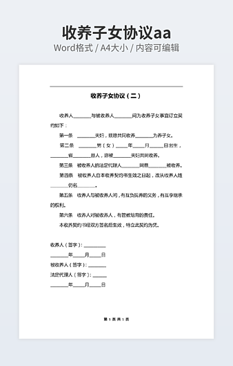 本作品内容为收养协议书范本下载,大小为20.72KB,作品为高清大图模板,格式为docx, 属于收养协议模板,作品模板源文件下载后可用编辑替换,模板中如有人物画像仅供参考禁止商用。小Q办公网-提供简历,PPT,Word,Excel优质模板素材下载模版平台,拥有海量的工作总结、竞聘求职、年终颁奖、计划书等。 通过小Q办公网下载收养协议模板源文件编辑修改源文件文字和图片即可使用。
