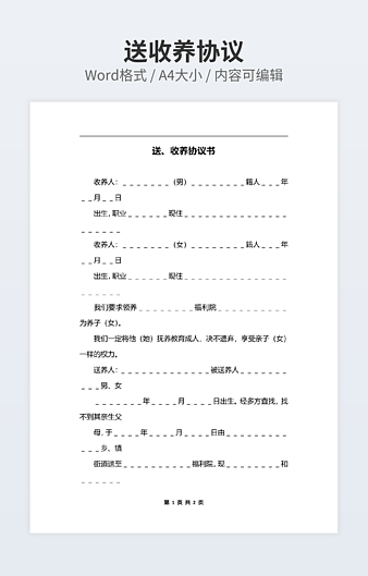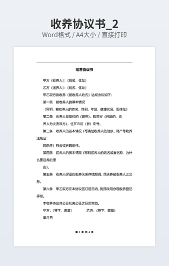 【特殊限制】设计师仅对作品中独创性部分享有著作权,对作品中含有的国旗、国徽等政治图案不享有权利,仅作为作品整体效果的示例展示,禁止商用。 相关关键词: 收养 协议书 范本
