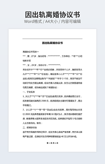 【特殊限制】设计师仅对作品中独创性部分享有著作权,对作品中含有的国旗、国徽等政治图案不享有权利,仅作为作品整体效果的示例展示,禁止商用。 相关关键词: 出轨 离婚 离婚协议 协议书 通用