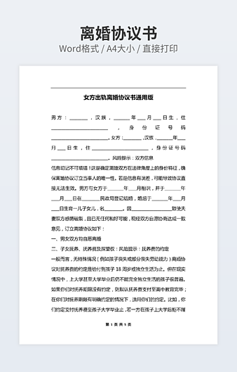 本作品内容为出轨离婚协议书通用版下载,大小为21.68KB,作品为高清大图模板,格式为docx, 属于出轨离婚协议书模板,作品模板源文件下载后可用编辑替换,模板中如有人物画像仅供参考禁止商用。小Q办公网-提供简历,PPT,Word,Excel优质模板素材下载模版平台,拥有海量的工作总结、竞聘求职、年终颁奖、计划书等。 通过小Q办公网下载出轨离婚协议书模板源文件编辑修改源文件文字和图片即可使用。