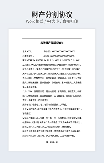 本作品内容为夫妻财产分割协议书 范本下载,大小为21.22KB,作品为高清大图模板,格式为docx, 属于财产分割模板,作品模板源文件下载后可用编辑替换,模板中如有人物画像仅供参考禁止商用。小Q办公网-提供简历,PPT,Word,Excel优质模板素材下载模版平台,拥有海量的工作总结、竞聘求职、年终颁奖、计划书等。 通过小Q办公网下载财产分割模板源文件编辑修改源文件文字和图片即可使用。