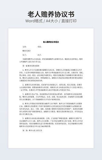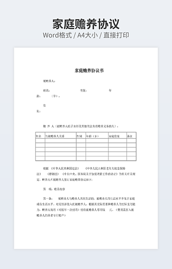 本作品内容为赡养协议书样本下载,大小为21.32KB,作品为高清大图模板,格式为docx, 属于赡养协议模板,作品模板源文件下载后可用编辑替换,模板中如有人物画像仅供参考禁止商用。小Q办公网-提供简历,PPT,Word,Excel优质模板素材下载模版平台,拥有海量的工作总结、竞聘求职、年终颁奖、计划书等。 通过小Q办公网下载赡养协议模板源文件编辑修改源文件文字和图片即可使用。