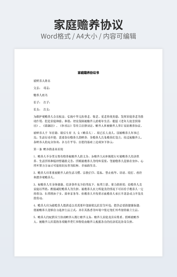 本作品内容为赡养老人财产继承协议下载,大小为21.7KB,作品为高清大图模板,格式为docx, 属于赡养协议模板,作品模板源文件下载后可用编辑替换,模板中如有人物画像仅供参考禁止商用。小Q办公网-提供简历,PPT,Word,Excel优质模板素材下载模版平台,拥有海量的工作总结、竞聘求职、年终颁奖、计划书等。 通过小Q办公网下载赡养协议模板源文件编辑修改源文件文字和图片即可使用。