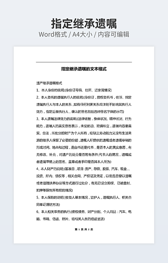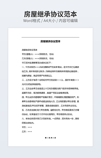 【特殊限制】设计师仅对作品中独创性部分享有著作权,对作品中含有的国旗、国徽等政治图案不享有权利,仅作为作品整体效果的示例展示,禁止商用。 相关关键词: 遗产继承 协议书 范本
