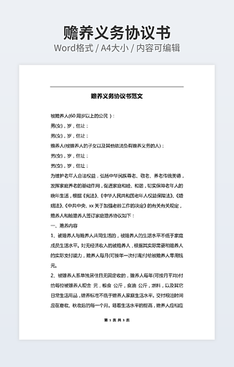 本作品内容为老人赡养协议下载,大小为28.5KB,作品为高清大图模板,格式为doc, 属于赡养协议模板,作品模板源文件下载后可用编辑替换,模板中如有人物画像仅供参考禁止商用。小Q办公网-提供简历,PPT,Word,Excel优质模板素材下载模版平台,拥有海量的工作总结、竞聘求职、年终颁奖、计划书等。 通过小Q办公网下载赡养协议模板源文件编辑修改源文件文字和图片即可使用。