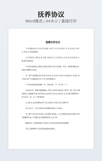 本作品内容为赡养及财产继承协议书 范本下载,大小为22.62KB,作品为高清大图模板,格式为docx, 属于赡养协议模板,作品模板源文件下载后可用编辑替换,模板中如有人物画像仅供参考禁止商用。小Q办公网-提供简历,PPT,Word,Excel优质模板素材下载模版平台,拥有海量的工作总结、竞聘求职、年终颁奖、计划书等。 通过小Q办公网下载赡养协议模板源文件编辑修改源文件文字和图片即可使用。