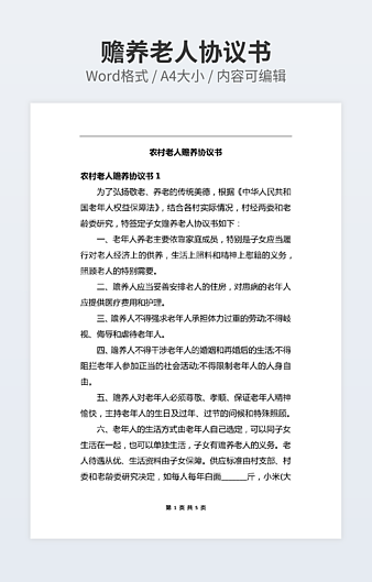本作品内容为送、收养协议书下载,大小为19.56KB,作品为高清大图模板,格式为docx, 属于赡养协议模板,作品模板源文件下载后可用编辑替换,模板中如有人物画像仅供参考禁止商用。小Q办公网-提供简历,PPT,Word,Excel优质模板素材下载模版平台,拥有海量的工作总结、竞聘求职、年终颁奖、计划书等。 通过小Q办公网下载赡养协议模板源文件编辑修改源文件文字和图片即可使用。