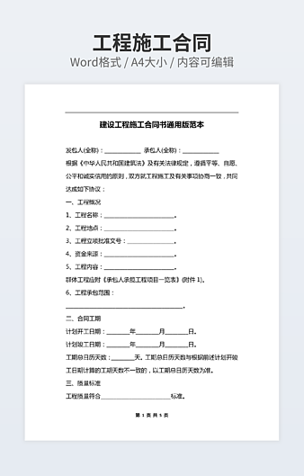 【特殊限制】设计师仅对作品中独创性部分享有著作权,对作品中含有的国旗、国徽等政治图案不享有权利,仅作为作品整体效果的示例展示,禁止商用。 相关关键词: 建设 工程施工 合同 通用 版本 模板