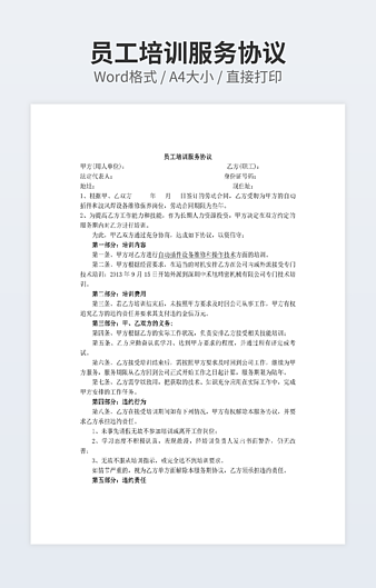 本作品内容为员工培训服务协议书下载,大小为26.5KB,作品为高清大图模板,格式为doc, 属于服务合同模板,作品模板源文件下载后可用编辑替换,模板中如有人物画像仅供参考禁止商用。小Q办公网-提供简历,PPT,Word,Excel优质模板素材下载模版平台,拥有海量的工作总结、竞聘求职、年终颁奖、计划书等。 通过小Q办公网下载服务合同模板源文件编辑修改源文件文字和图片即可使用。