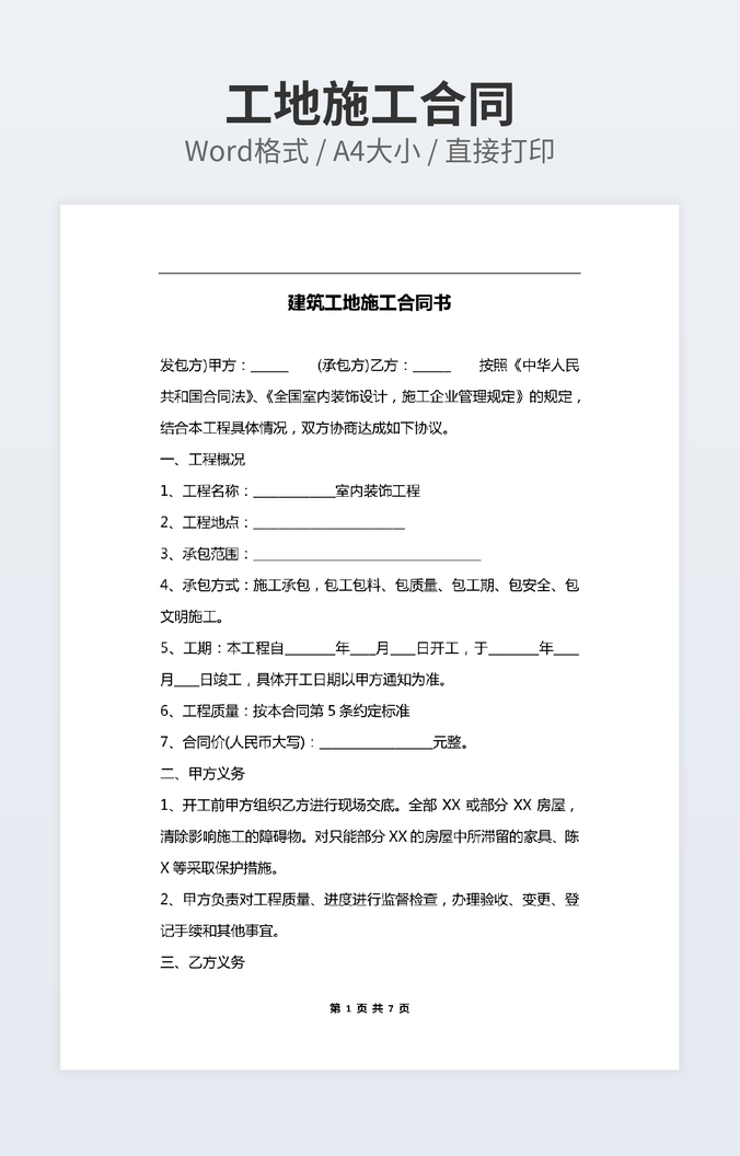 【特殊限制】设计师仅对作品中独创性部分享有著作权,对作品中含有的国旗、国徽等政治图案不享有权利,仅作为作品整体效果的示例展示,禁止商用。 相关关键词: 工地 施工 合同