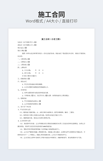 本作品内容为小工程施工合同书模板下载,大小为21.72KB,作品为高清大图模板,格式为docx, 属于施工合同模板,作品模板源文件下载后可用编辑替换,模板中如有人物画像仅供参考禁止商用。小Q办公网-提供简历,PPT,Word,Excel优质模板素材下载模版平台,拥有海量的工作总结、竞聘求职、年终颁奖、计划书等。 通过小Q办公网下载施工合同模板源文件编辑修改源文件文字和图片即可使用。