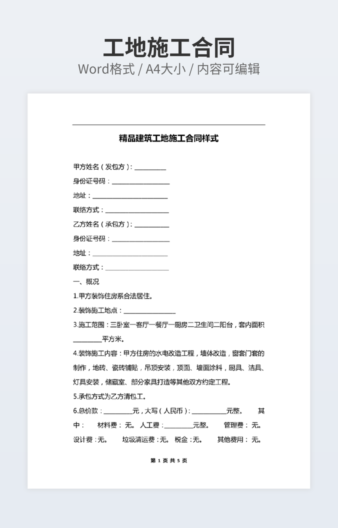 【特殊限制】设计师仅对作品中独创性部分享有著作权,对作品中含有的国旗、国徽等政治图案不享有权利,仅作为作品整体效果的示例展示,禁止商用。 相关关键词: 工装 装修施工 合同 模板