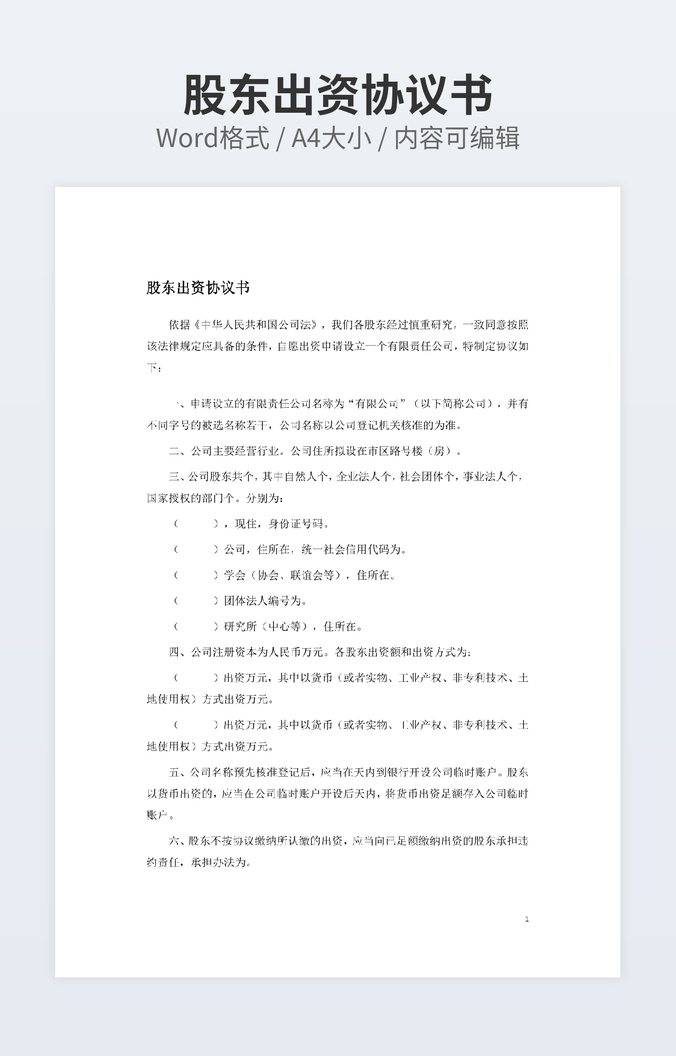 【特殊限制】设计师仅对作品中独创性部分享有著作权,对作品中含有的国旗、国徽等政治图案不享有权利,仅作为作品整体效果的示例展示,禁止商用。 相关关键词: 股东出资 协议书 样书