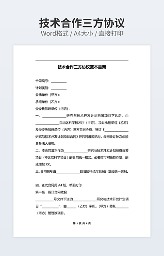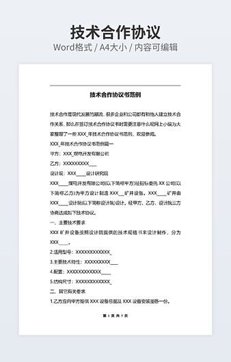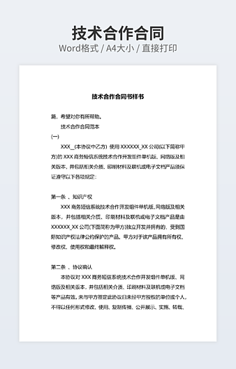 本作品内容为技术入股合作协议书样书下载,大小为21.41KB,作品为高清大图模板,格式为docx, 属于技术合作模板,作品模板源文件下载后可用编辑替换,模板中如有人物画像仅供参考禁止商用。小Q办公网-提供简历,PPT,Word,Excel优质模板素材下载模版平台,拥有海量的工作总结、竞聘求职、年终颁奖、计划书等。 通过小Q办公网下载技术合作模板源文件编辑修改源文件文字和图片即可使用。