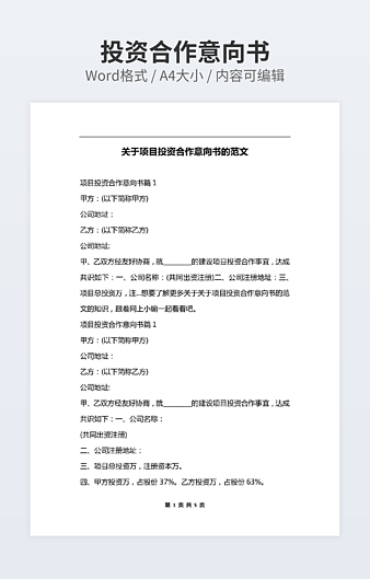 本作品内容为经营投资合作协议书下载,大小为21.3KB,作品为高清大图模板,格式为docx, 属于投资合作模板,作品模板源文件下载后可用编辑替换,模板中如有人物画像仅供参考禁止商用。小Q办公网-提供简历,PPT,Word,Excel优质模板素材下载模版平台,拥有海量的工作总结、竞聘求职、年终颁奖、计划书等。 通过小Q办公网下载投资合作模板源文件编辑修改源文件文字和图片即可使用。