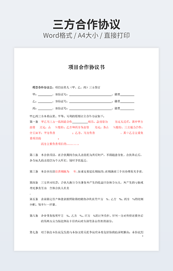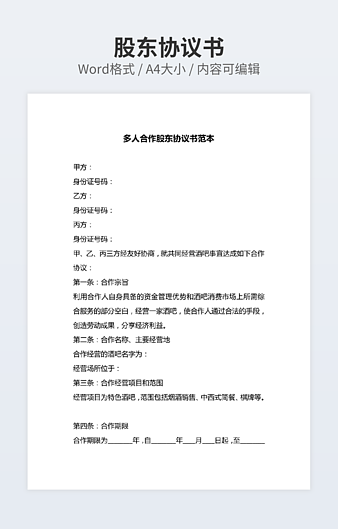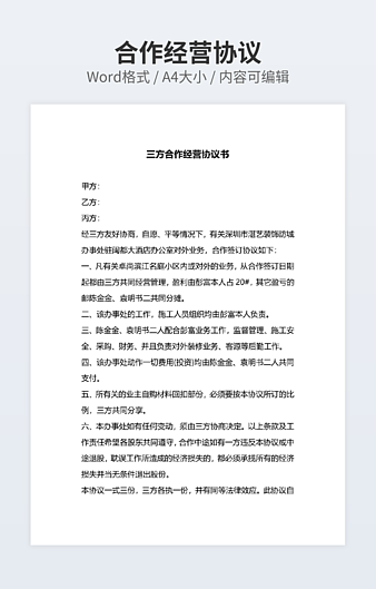 本作品内容为三人酒店合伙合同下载,大小为30.5KB,作品为高清大图模板,格式为doc, 属于多人合作模板,作品模板源文件下载后可用编辑替换,模板中如有人物画像仅供参考禁止商用。小Q办公网-提供简历,PPT,Word,Excel优质模板素材下载模版平台,拥有海量的工作总结、竞聘求职、年终颁奖、计划书等。 通过小Q办公网下载多人合作模板源文件编辑修改源文件文字和图片即可使用。
