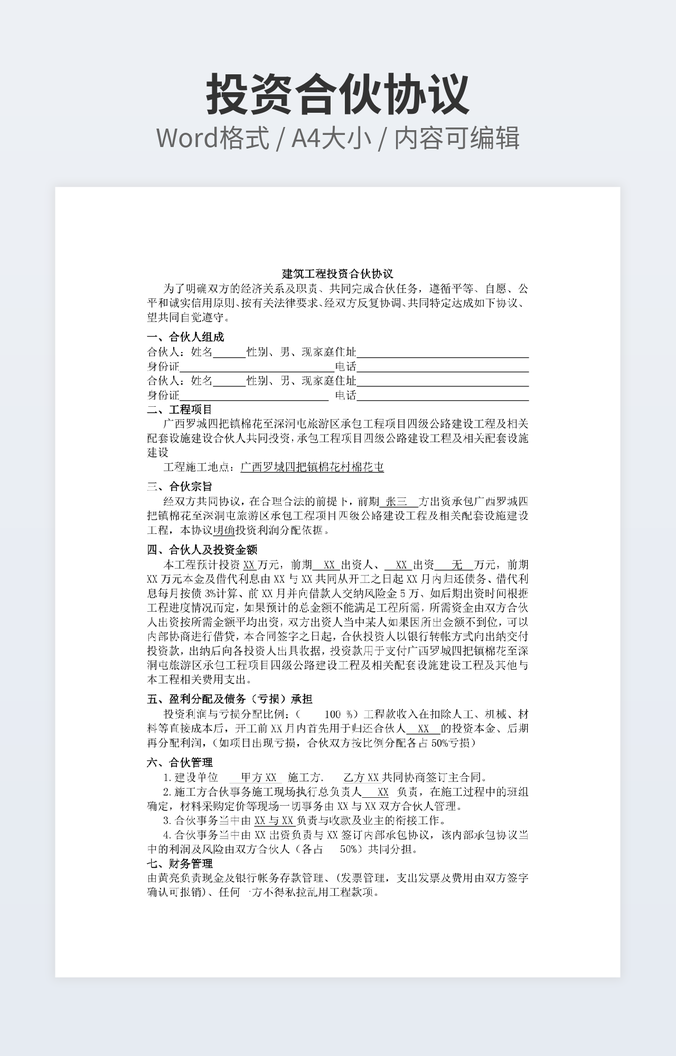 本作品内容为企业合伙协议书样本下载,大小为21.06KB,作品为高清大图模板,格式为docx, 属于投资协议模板,作品模板源文件下载后可用编辑替换,模板中如有人物画像仅供参考禁止商用。小Q办公网-提供简历,PPT,Word,Excel优质模板素材下载模版平台,拥有海量的工作总结、竞聘求职、年终颁奖、计划书等。 通过小Q办公网下载投资协议模板源文件编辑修改源文件文字和图片即可使用。