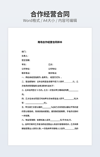 本作品内容为公司项目合作开发合同样书下载,大小为20.03KB,作品为高清大图模板,格式为docx, 属于经营合作模板,作品模板源文件下载后可用编辑替换,模板中如有人物画像仅供参考禁止商用。小Q办公网-提供简历,PPT,Word,Excel优质模板素材下载模版平台,拥有海量的工作总结、竞聘求职、年终颁奖、计划书等。 通过小Q办公网下载经营合作模板源文件编辑修改源文件文字和图片即可使用。