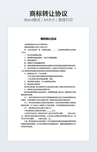 本作品内容为翻译版权许可合同范文下载,大小为28.5KB,作品为高清大图模板,格式为doc, 属于商标合同模板,作品模板源文件下载后可用编辑替换,模板中如有人物画像仅供参考禁止商用。小Q办公网-提供简历,PPT,Word,Excel优质模板素材下载模版平台,拥有海量的工作总结、竞聘求职、年终颁奖、计划书等。 通过小Q办公网下载商标合同模板源文件编辑修改源文件文字和图片即可使用。