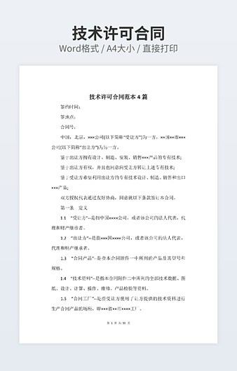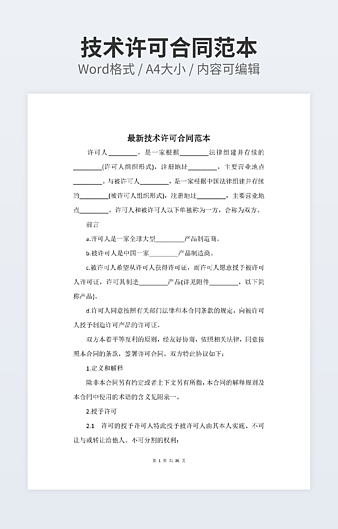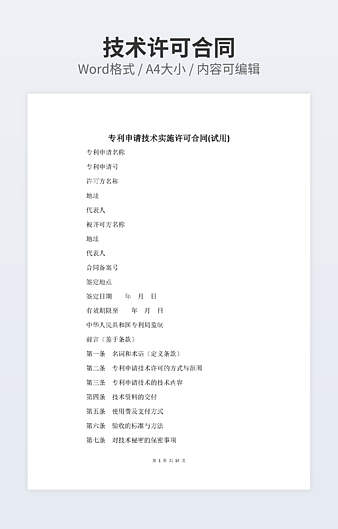 本作品内容为专利申请技术实施许可合同下载,大小为24.68KB,作品为高清大图模板,格式为docx, 属于技术许可模板,作品模板源文件下载后可用编辑替换,模板中如有人物画像仅供参考禁止商用。小Q办公网-提供简历,PPT,Word,Excel优质模板素材下载模版平台,拥有海量的工作总结、竞聘求职、年终颁奖、计划书等。 通过小Q办公网下载技术许可模板源文件编辑修改源文件文字和图片即可使用。
