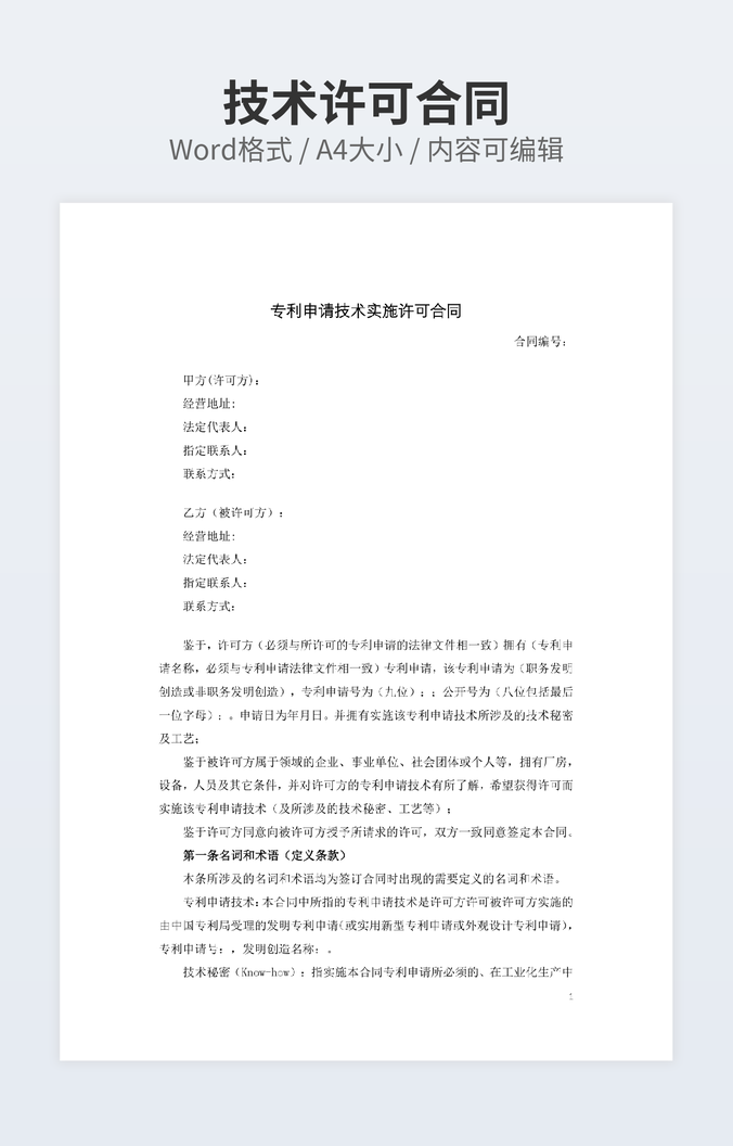 本作品内容为技术许可协议下载,大小为24.91KB,作品为高清大图模板,格式为docx, 属于技术许可模板,作品模板源文件下载后可用编辑替换,模板中如有人物画像仅供参考禁止商用。小Q办公网-提供简历,PPT,Word,Excel优质模板素材下载模版平台,拥有海量的工作总结、竞聘求职、年终颁奖、计划书等。 通过小Q办公网下载技术许可模板源文件编辑修改源文件文字和图片即可使用。