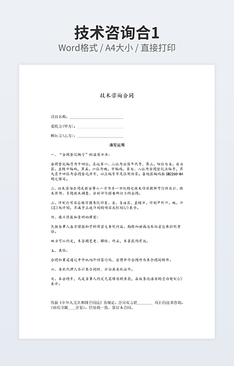 本作品内容为技术咨询合同2下载,大小为18.19KB,作品为高清大图模板,格式为docx, 属于技术咨询模板,作品模板源文件下载后可用编辑替换,模板中如有人物画像仅供参考禁止商用。小Q办公网-提供简历,PPT,Word,Excel优质模板素材下载模版平台,拥有海量的工作总结、竞聘求职、年终颁奖、计划书等。 通过小Q办公网下载技术咨询模板源文件编辑修改源文件文字和图片即可使用。
