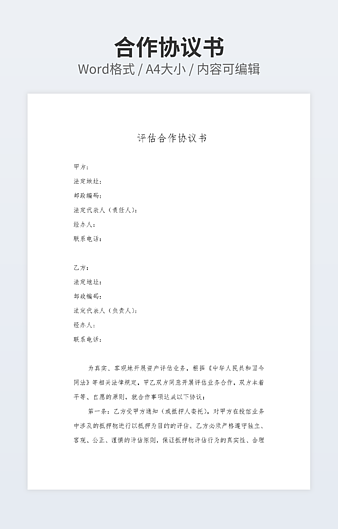 【特殊限制】设计师仅对作品中独创性部分享有著作权,对作品中含有的国旗、国徽等政治图案不享有权利,仅作为作品整体效果的示例展示,禁止商用。 相关关键词: 个人 合伙 合伙人 合作 协议书