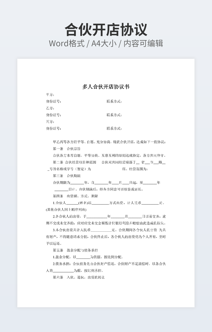 【特殊限制】设计师仅对作品中独创性部分享有著作权,对作品中含有的国旗、国徽等政治图案不享有权利,仅作为作品整体效果的示例展示,禁止商用。 相关关键词: 合伙 协议 范本