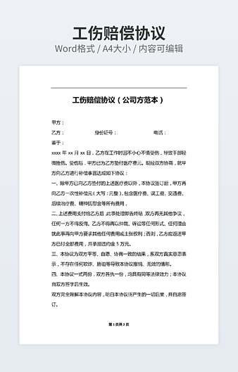 【特殊限制】设计师仅对作品中独创性部分享有著作权,对作品中含有的国旗、国徽等政治图案不享有权利,仅作为作品整体效果的示例展示,禁止商用。 相关关键词: 一次性 工伤 赔偿 协议书