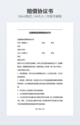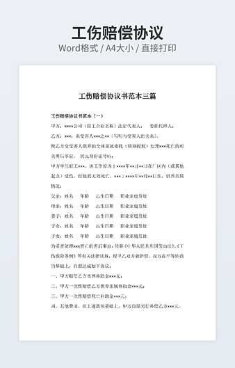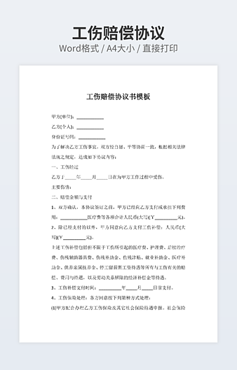 【特殊限制】设计师仅对作品中独创性部分享有著作权,对作品中含有的国旗、国徽等政治图案不享有权利,仅作为作品整体效果的示例展示,禁止商用。 相关关键词: 工伤事故 赔偿 协议书 通用 范本