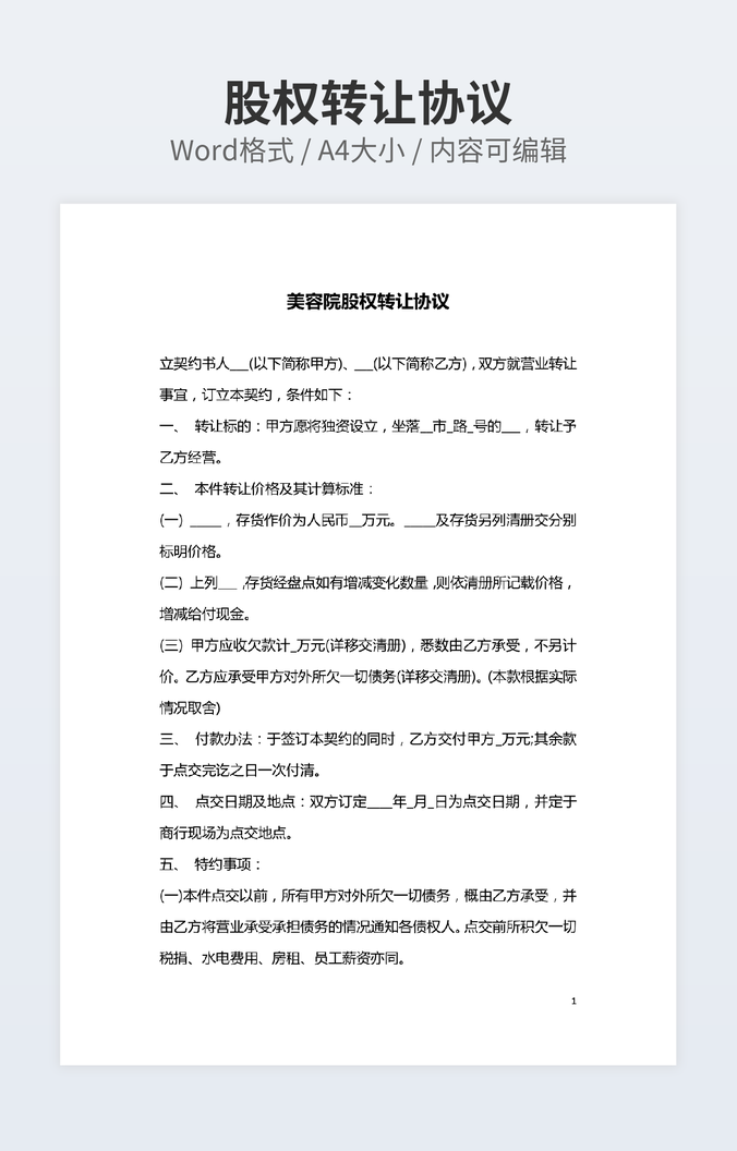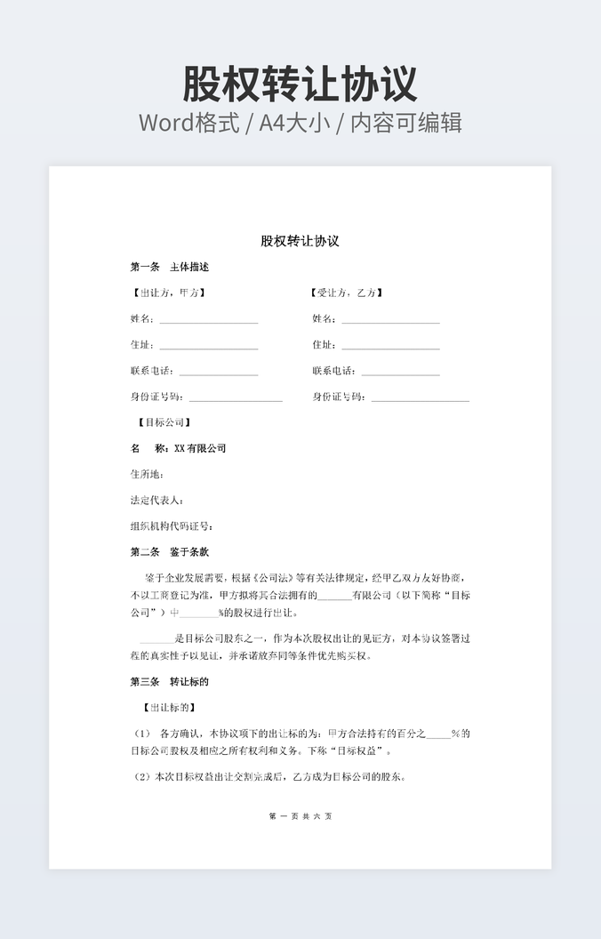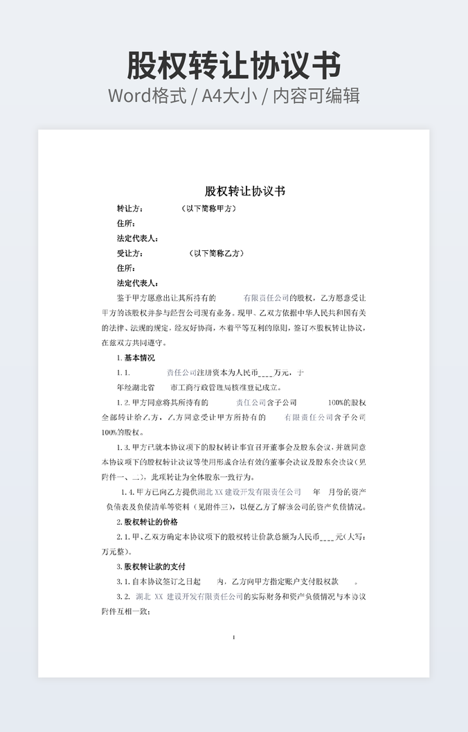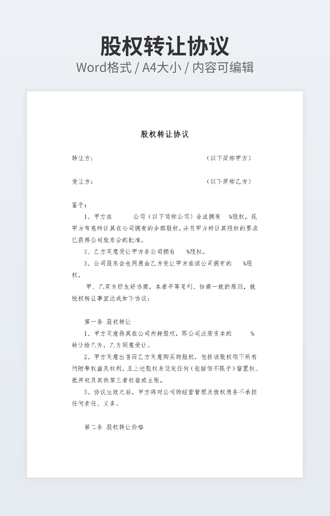 【特殊限制】设计师仅对作品中独创性部分享有著作权,对作品中含有的国旗、国徽等政治图案不享有权利,仅作为作品整体效果的示例展示,禁止商用。 相关关键词: 公司 股权 整体 转让 收购 协议