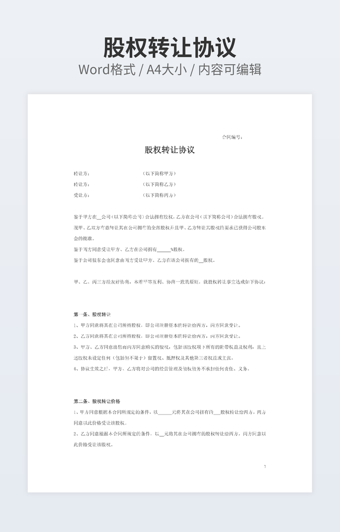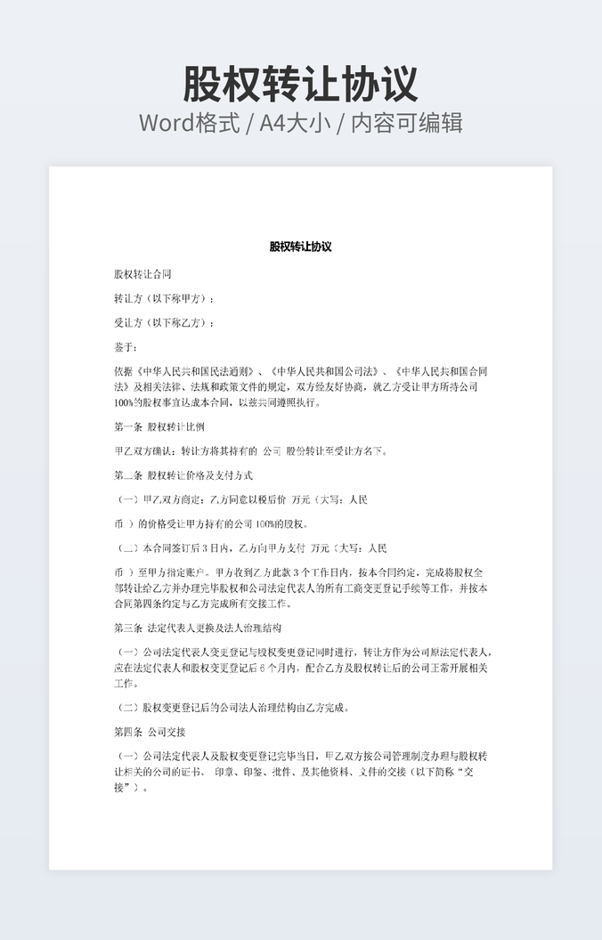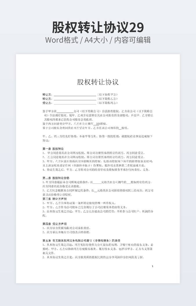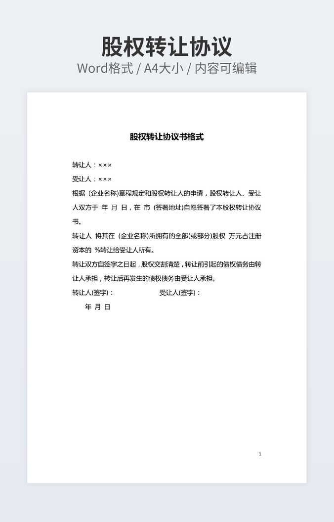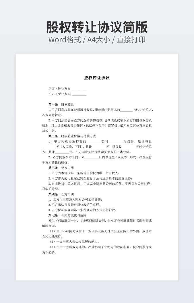 【特殊限制】设计师仅对作品中独创性部分享有著作权,对作品中含有的国旗、国徽等政治图案不享有权利,仅作为作品整体效果的示例展示,禁止商用。 相关关键词: 股权转让 协议