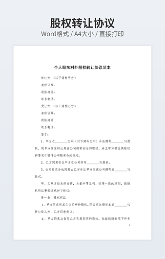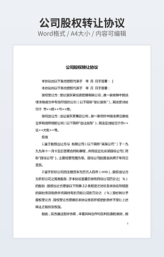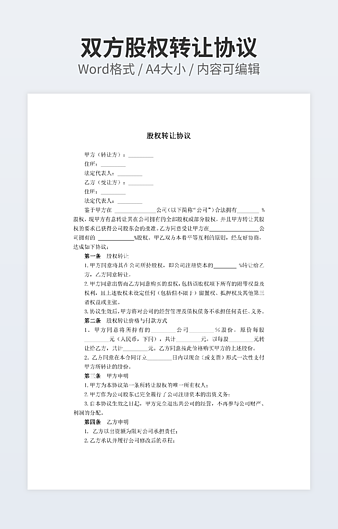 【特殊限制】设计师仅对作品中独创性部分享有著作权,对作品中含有的国旗、国徽等政治图案不享有权利,仅作为作品整体效果的示例展示,禁止商用。 相关关键词: 有限责任 公司 股权转让 协议