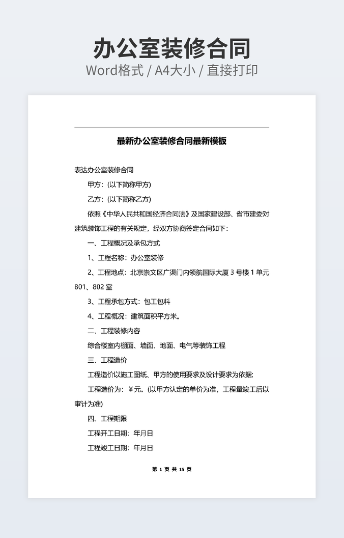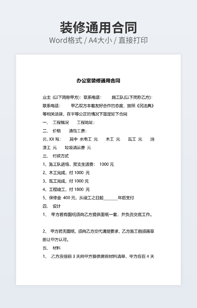 本作品内容为油漆装修的合同范本下载,大小为21.75KB,作品为高清大图模板,格式为docx, 属于房屋装修模板,作品模板源文件下载后可用编辑替换,模板中如有人物画像仅供参考禁止商用。小Q办公网-提供简历,PPT,Word,Excel优质模板素材下载模版平台,拥有海量的工作总结、竞聘求职、年终颁奖、计划书等。 通过小Q办公网下载房屋装修模板源文件编辑修改源文件文字和图片即可使用。